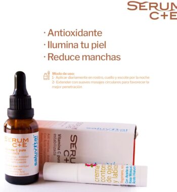 El Serum Facial C+E de Saluvital, contiene un 90,61% de ingredientes naturales. Su combinación de activos de última generación como la Vitamina C pura estable, vitaminas de los grupos E, B y alfa hidroxiácidos que blanquean la piel inhibiendo el contenido de melanina. Reduce las manchas provocadas por el sol y la edad, unificando el tono de la piel y ayuda a sintetizar de forma natural el colágeno, protegiendo de la oxidación y reduciendo los efectos nocivos de los radicales libres. Gracias a su contenido de Aloe Vera y Ácido Hialurónico hidrata en profundidad, mejora la firmeza y elasticidad de la piel proporcionando un aspecto uniforme, luminoso y relajado.